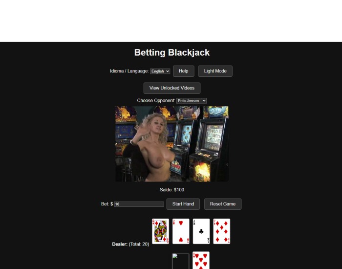 Description: Step into the high-stakes world of adult Blackjack, where every hand brings a mix of thrill and temptation. Bet wisely, play strategically, and see if you can outsmart the dealer to win big. But winning isn’t just about the money—each victory unlocks exclusive adult videos tailored to your chosen opponent. With multiple opponents to challenge, language options, and a sleek dark mode, this game combines classic card strategy with enticing rewards. Are you ready to play your cards right and unlock all the secrets?